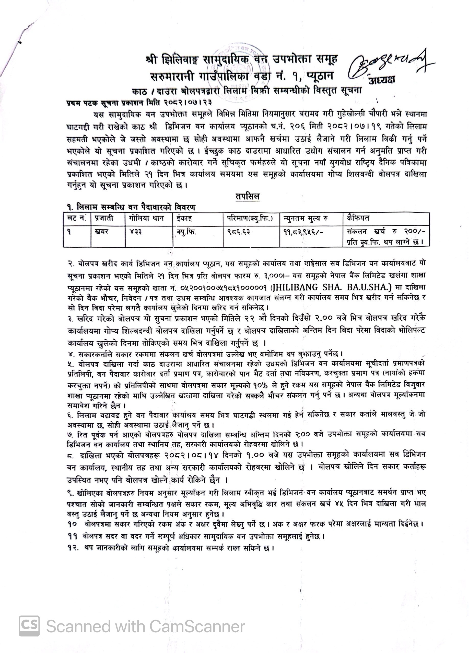 झिलिवाङ्ग सामुदायिक वन उपभोक्ता समूह, सरुमारानी-१, प्यूठानको काठ दाउरा लिलाम बिक्रीको सूचना