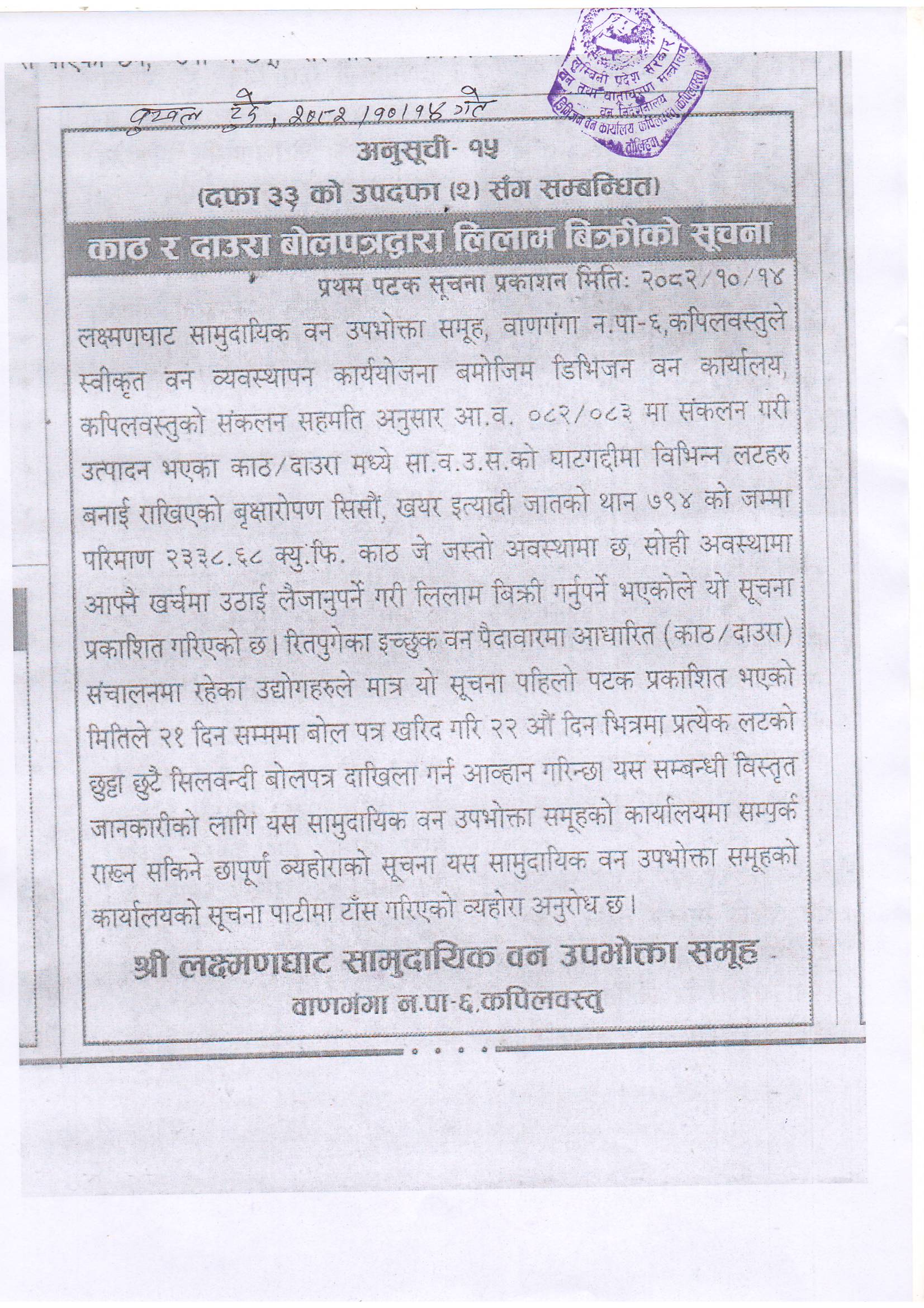 श्री लक्ष्मणघाट सामुदायिक वन उपभोक्ता समूह वाणगंगा न.पा. - ६, कपिलवस्तुको काठ र दाउरा बोलपत्रद्बारा लिलाम बिक्रीको सूचना