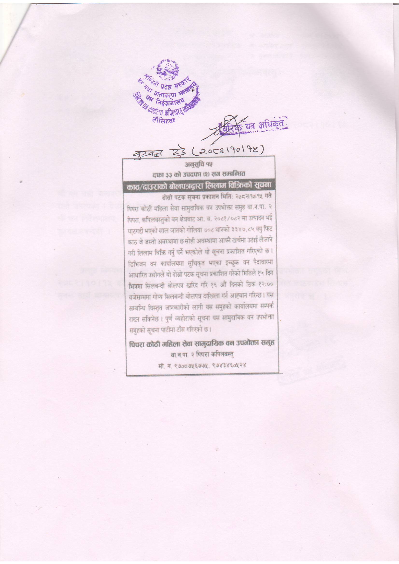 श्री पिपरा कोठी महिला सेवा सामुदायिक वन उपभोक्ता समूह वा.न.पा. -२ पिपरा कपिलवस्तुको काठ/दाउराको बोलपत्रद्बारा लिलाम बिक्रीको सूचना