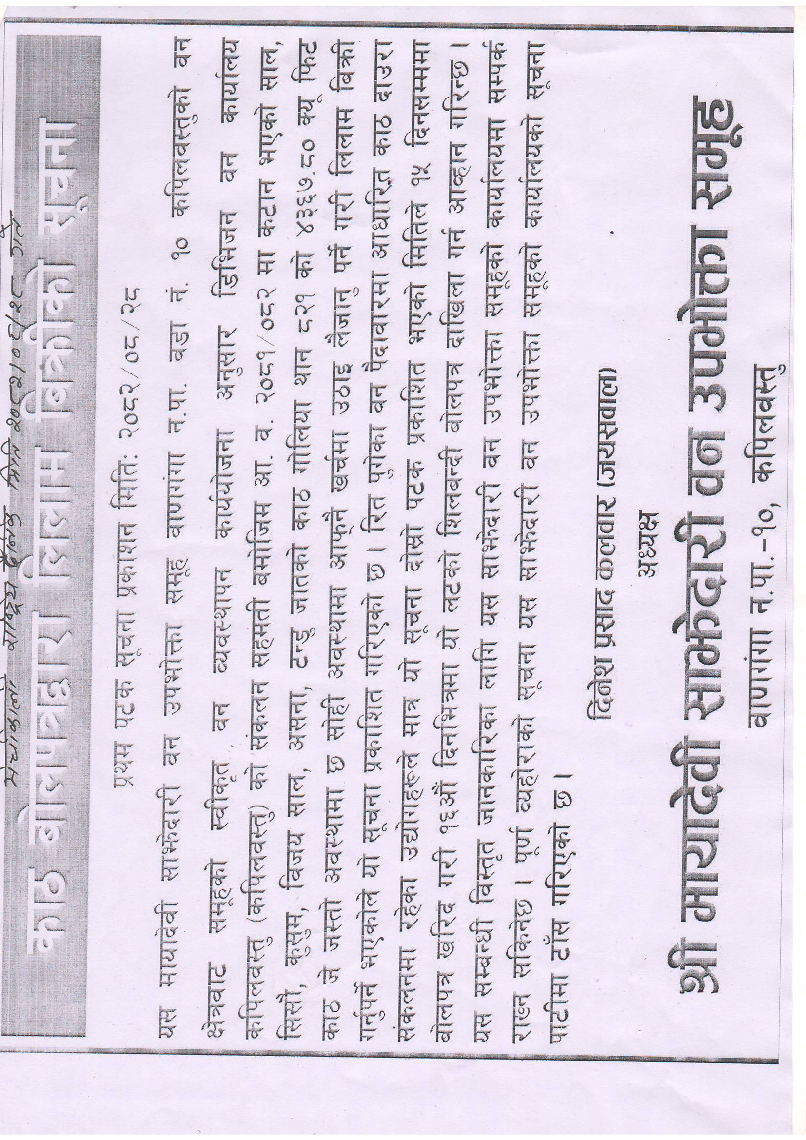 श्री मायादेवी साझेदारी वन उपभोक्ता समूह वाणगंगा न.पा.-१०, कपिलवस्तुको काठ लिलाम बिक्रीको सूचना
