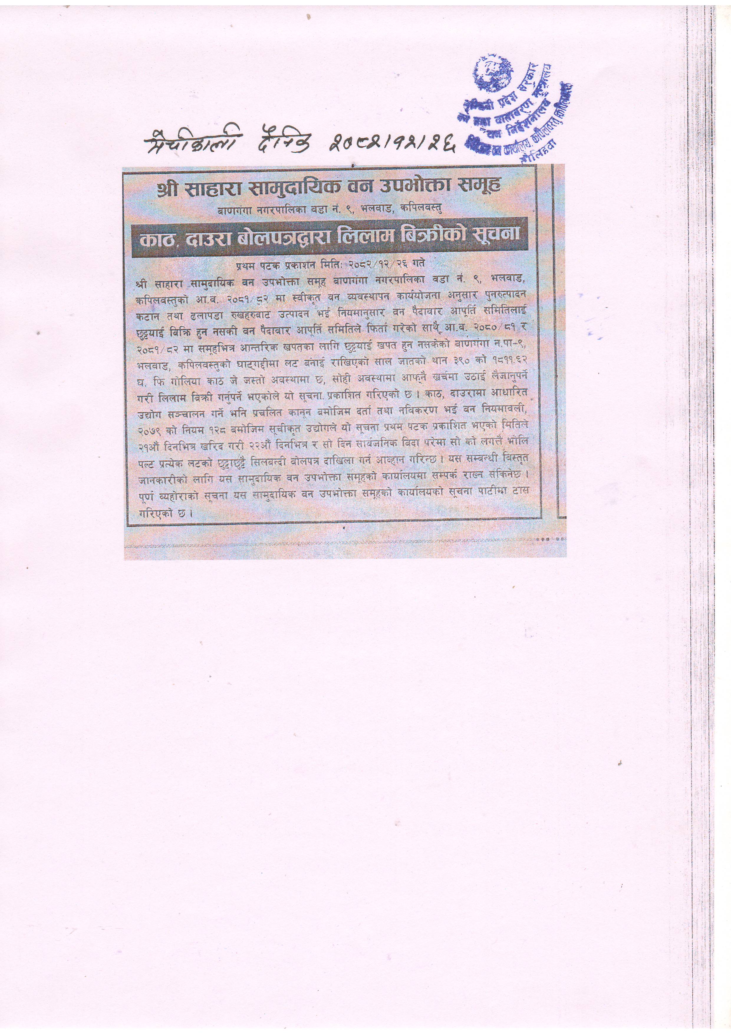 साहारा सामुदायिक वन उपभोक्ता समूह, वाणगंगा न.पा.-९, कपिलवस्तुको काठ दाउरा लिलाम बिक्रीको सूचना