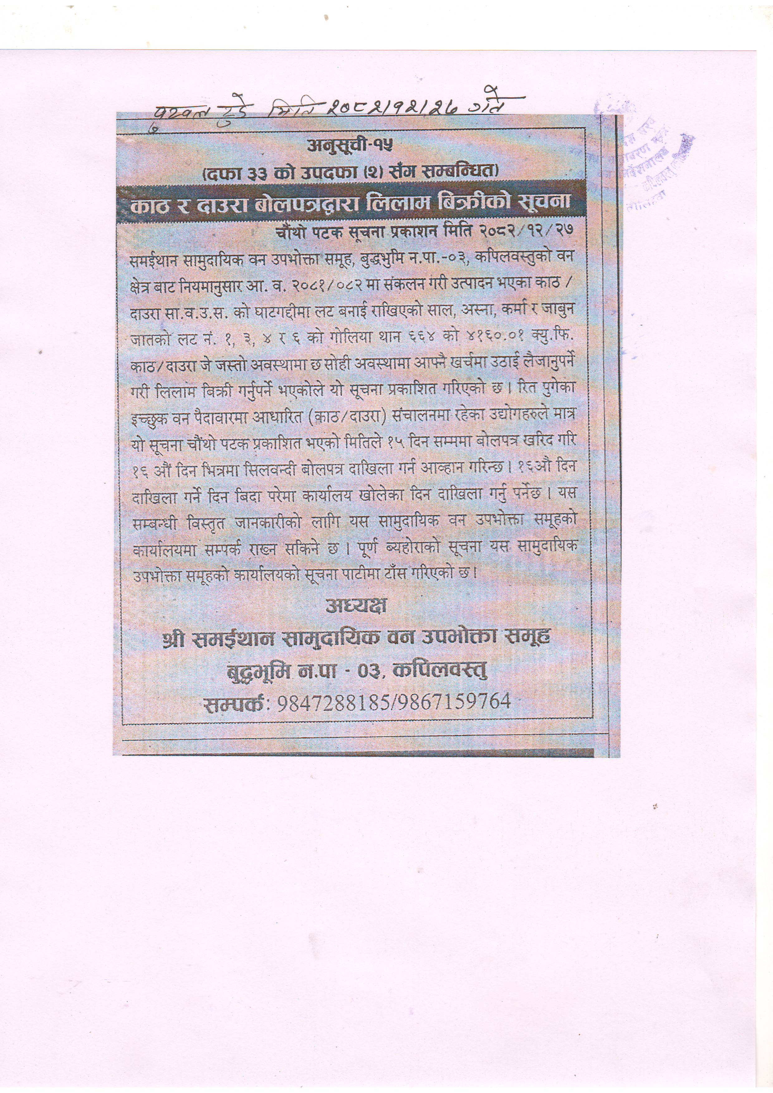 समईथान सामुदायिक वन उपभोक्ता समूह, बुद्धभूमी न.पा.-३, कपिलवस्तुको काठ दाउरा लिलाम बिक्रीको सूचना
