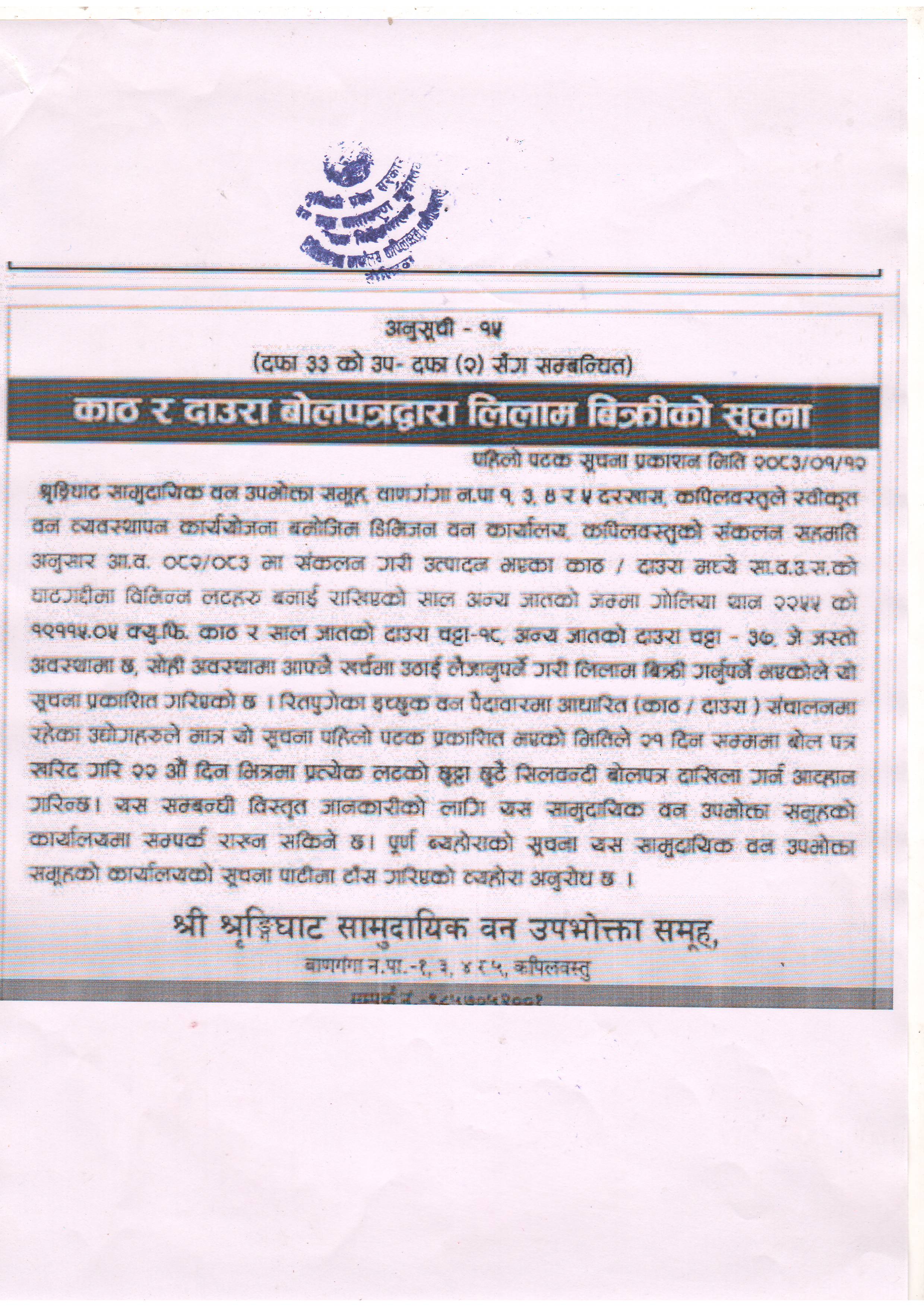 हडियामामाई सामुदायिक वन उपभोक्ता समूह, रामग्राम न.पा.-१४, को काठ लिलाम बिक्रीको सूचना