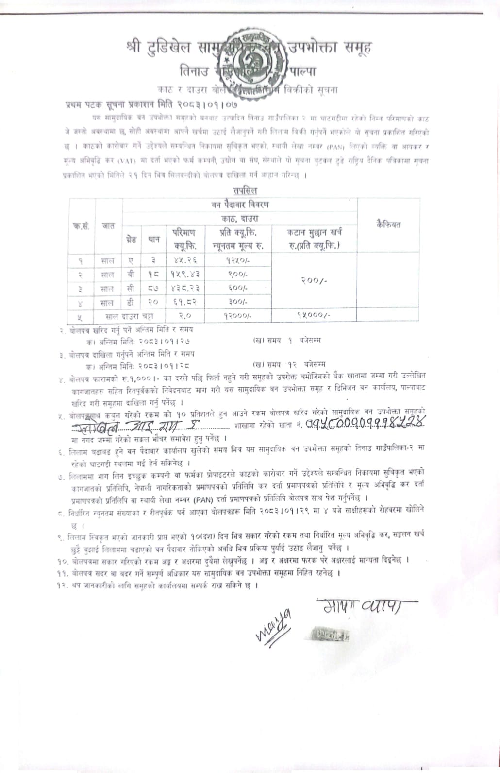 खहरे ठूलो बगर सामुदायिक वन उपभोक्ता समूह, बगनासकाली-६, पाल्पाको काठ लिलाम बिक्रीको सूचना