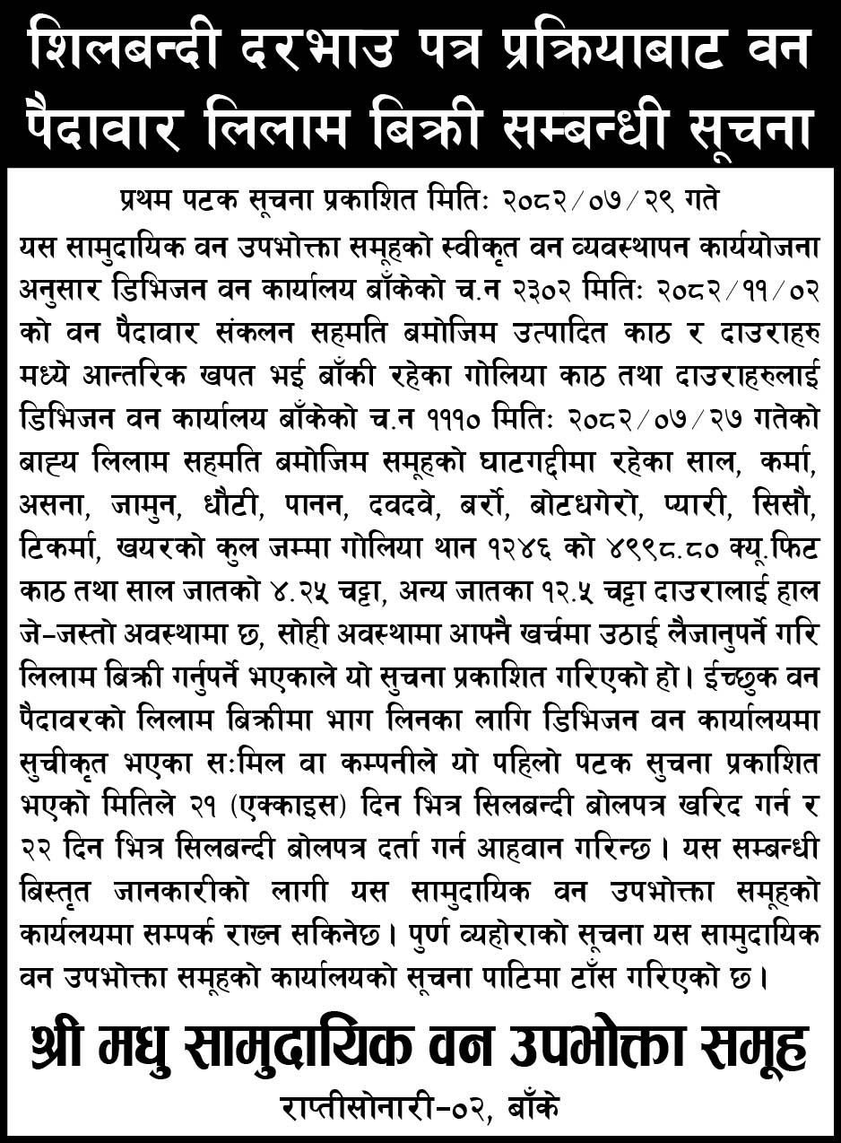 श्री मधु सामुदायिक वन उपभोक्ता समूह राप्तीसोनारी २ बाँकेको काठ दाउरा लिलाम बिक्रीको सूचना