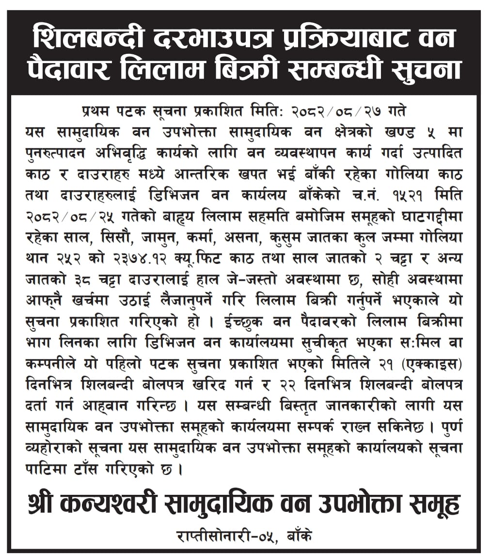 श्री कन्यश्वरी सामुदायिक वन उपभोक्ता समूह राप्तीसोनारी - ०५, बाँकेको काठ/दाउरा लिलाम बिक्रीको सूचना