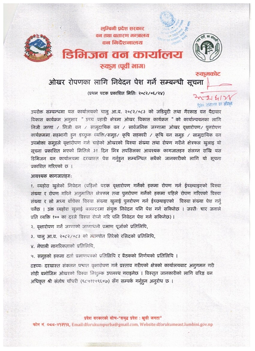 डिभिजन वन कार्यालय, रुकुम पूर्वको ओखर रोपणका लागि निवेदन पेश गर्ने सम्बन्धी सूचना