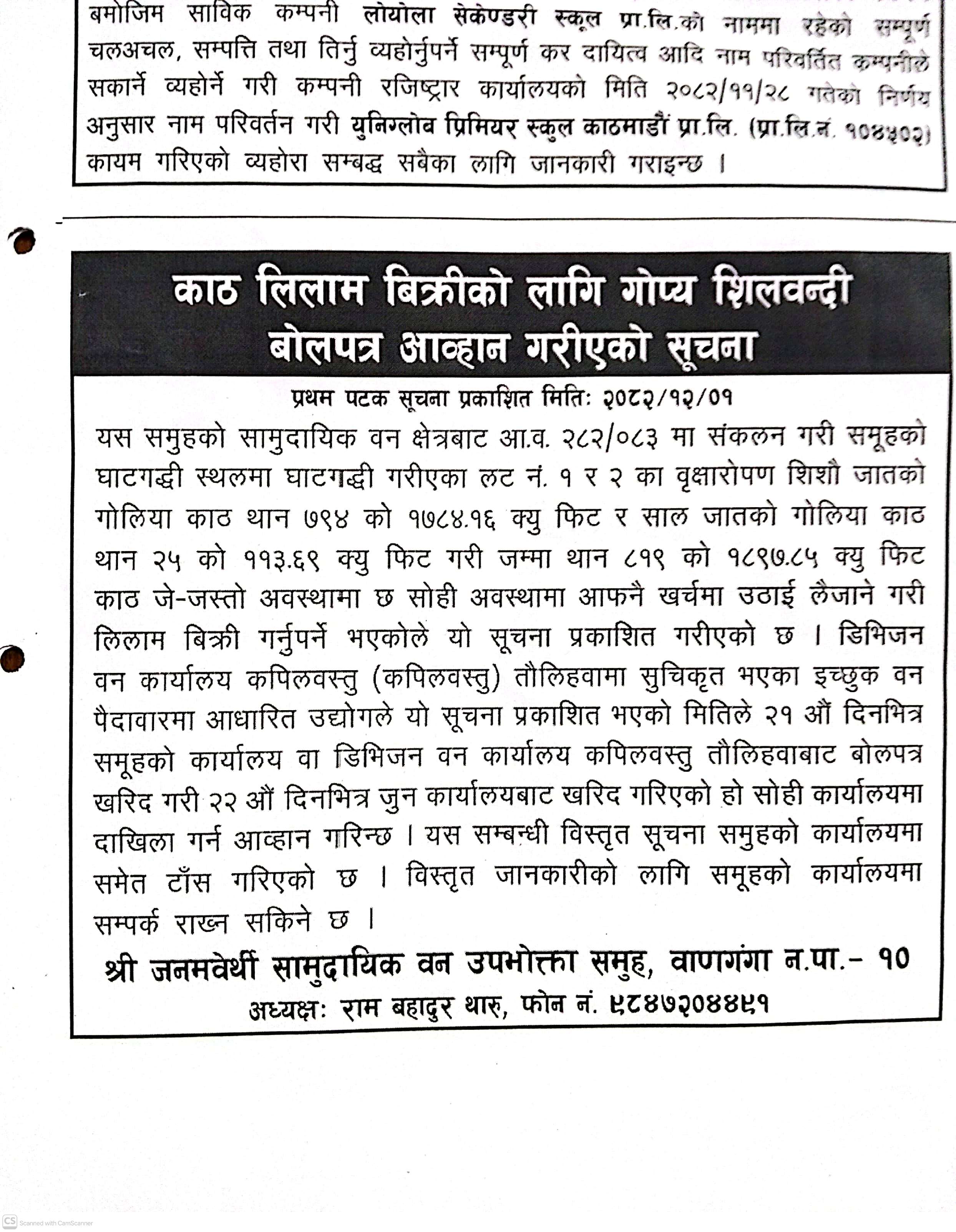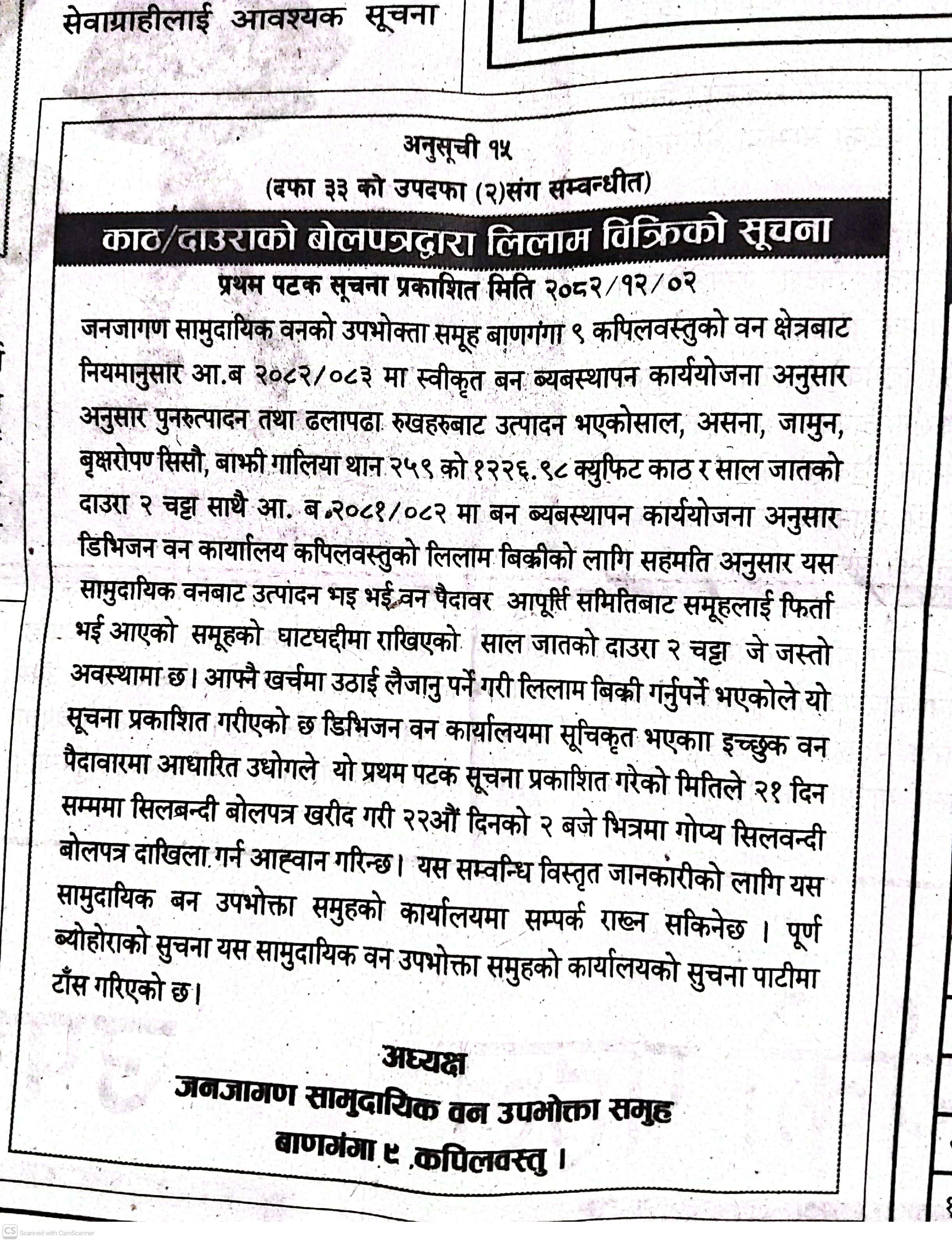 जनजागरण सामुदायिक वन उपभोक्ता समुह वाणगंगा ९ कपिवस्तुको काठ दाउराको बोलपत्र लिलाम बिक्री सूचना