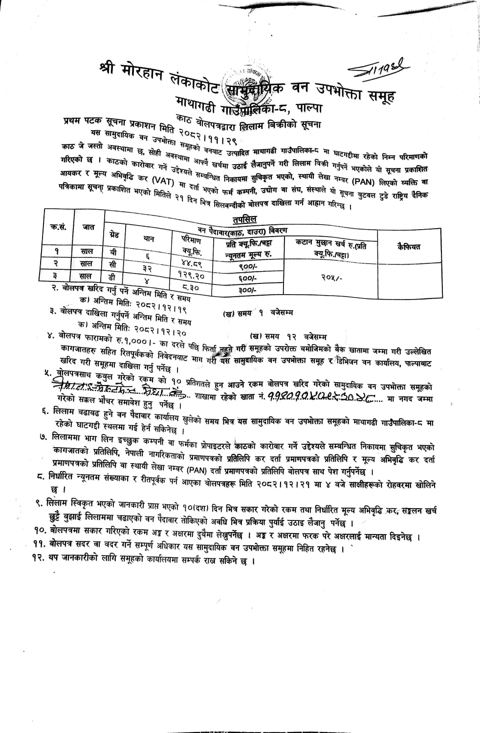 श्री मुसीवान सामुदायिक वन उपभोक्ता समुह, शि.न.पा-१३, अर्घाखाँचीको काठ/दाउरा लिलाम सम्बन्धी सूचना ।