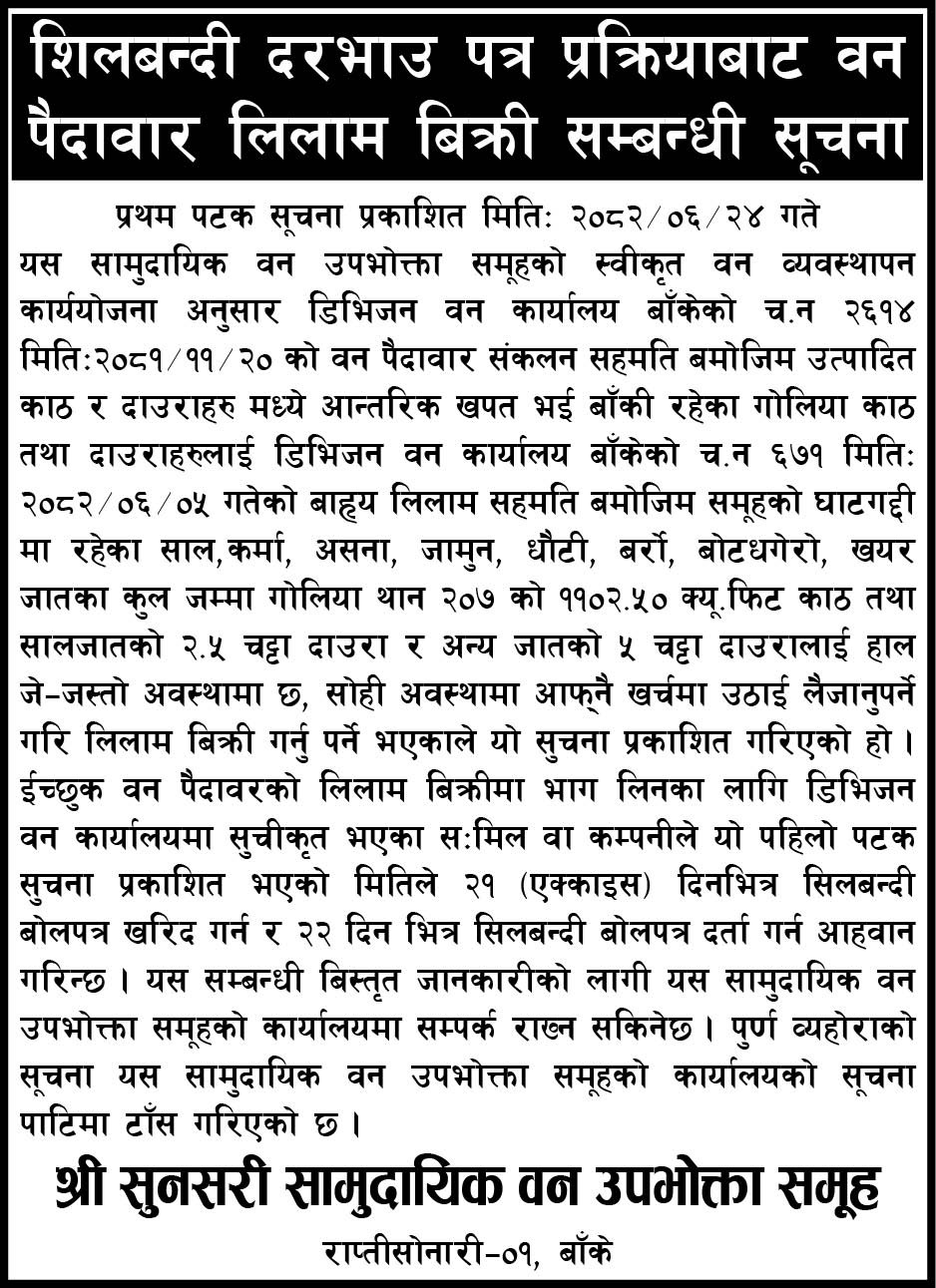 सुनसरी सामुदायिक वन उपभोक्त समूह, राप्तीसोनारी-०१, बाँकेको काठ दाउरा लिलाम बिक्रीको सुचना